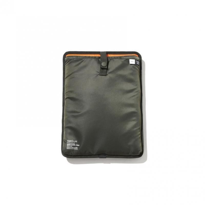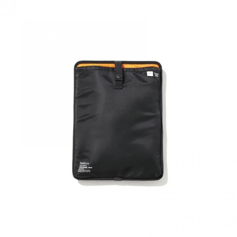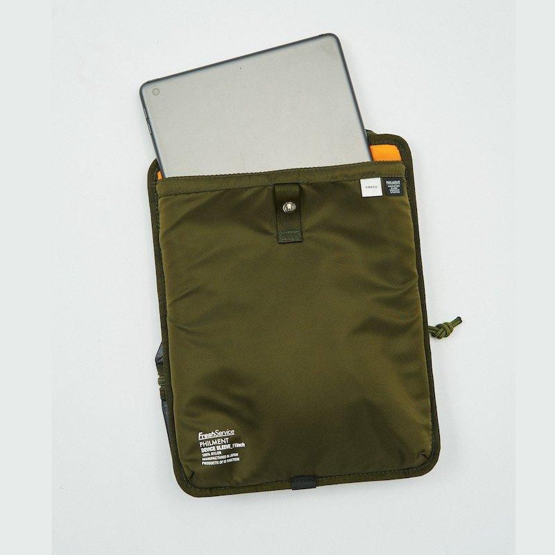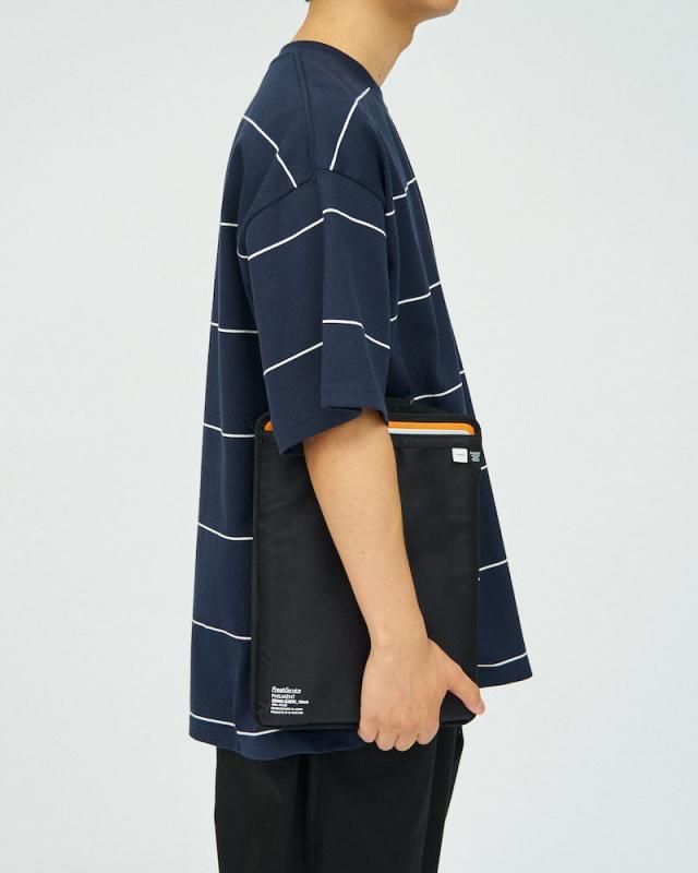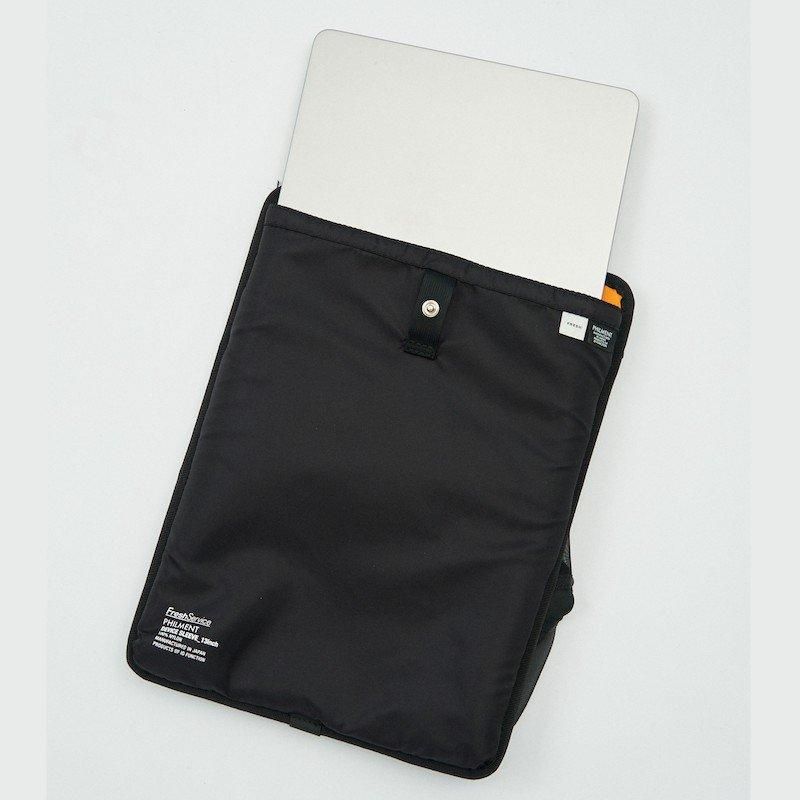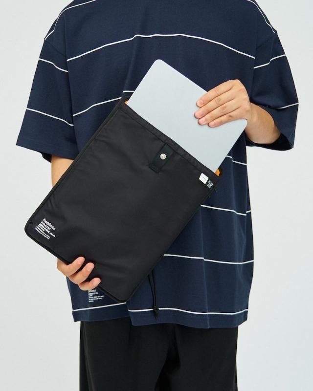 高密度で耐摩擦性に優れたフライトナイロンを使用し、裏地はフライトジャケットを彷彿させるレスキューオレンジに。13インチのPCやiPadに対応。反対面にはマウスや充電コード、モバイルバッテリーなどガジェット類をまとめて収納出来るマイクロメッシュのポケットを装備。