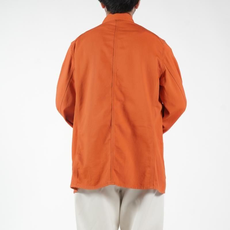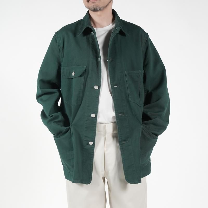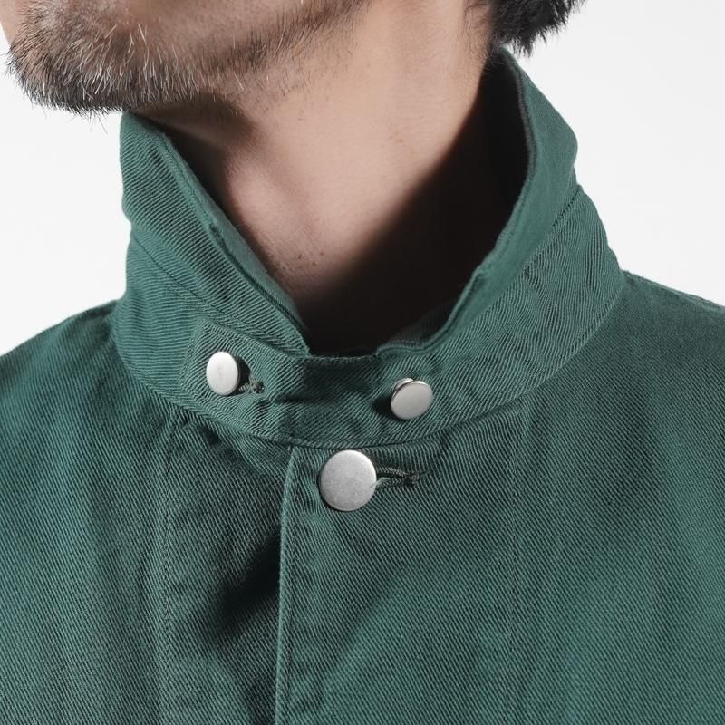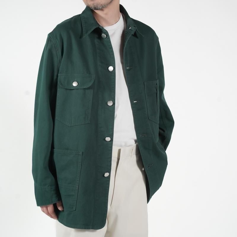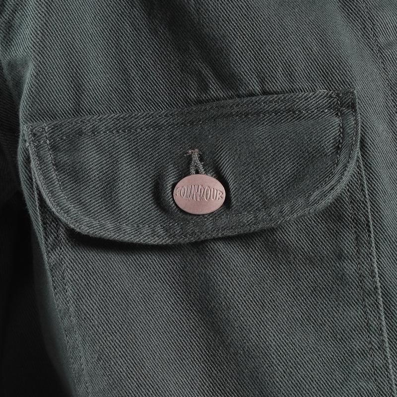「最高にカッコいいカバーオールをつくりたい」。その想いを出発点にアーカイブを漁り、大手デニムブランドによる1930年代の1着に辿り着きました。チンストラップ付きで、ボタンはすべてチェンジボタンで構成。時代的にはまだテーラードの名残がありつつも、カバーオールらしいフォルムに変遷を遂げていった時期のアイテムです。そこにぼくは贅沢さを感じました。アクションプリーツなどの簡略化されたパターンではなく、テーラードの技術によって動きやすさが確保され、さらにはシルエットも立体的で美しいアイテム。そこに作業着としてのディテールも加わり、唯一無二の存在感を放ちます。こうしたアイテムはヴィンテージに忠実につくりたくなるところですが、〈FOUNDOUR〉では胸ポケットのみ、チェンジボタンに仕様をアレンジ。カラーバリエーションにもあえて遊び心を加えることで、ぼくたちらしい“ハズし”の提案をしています。