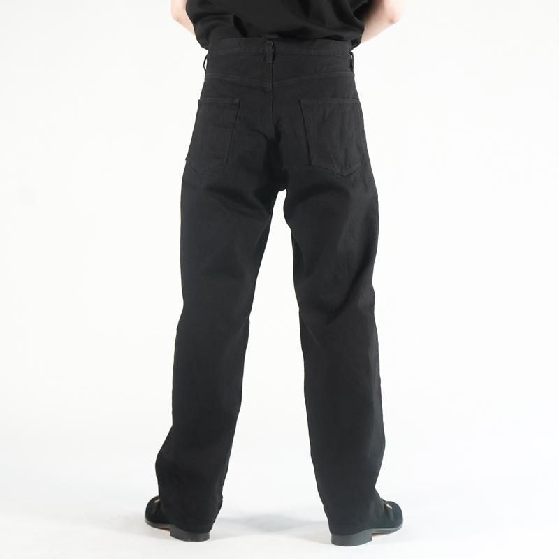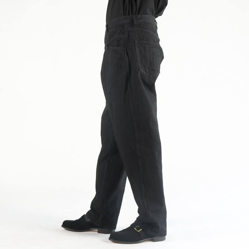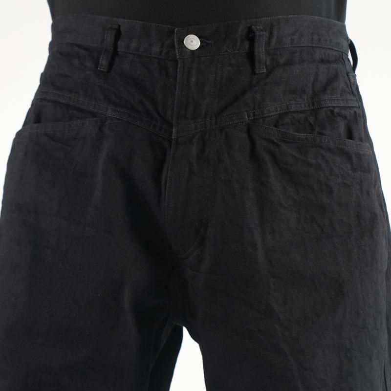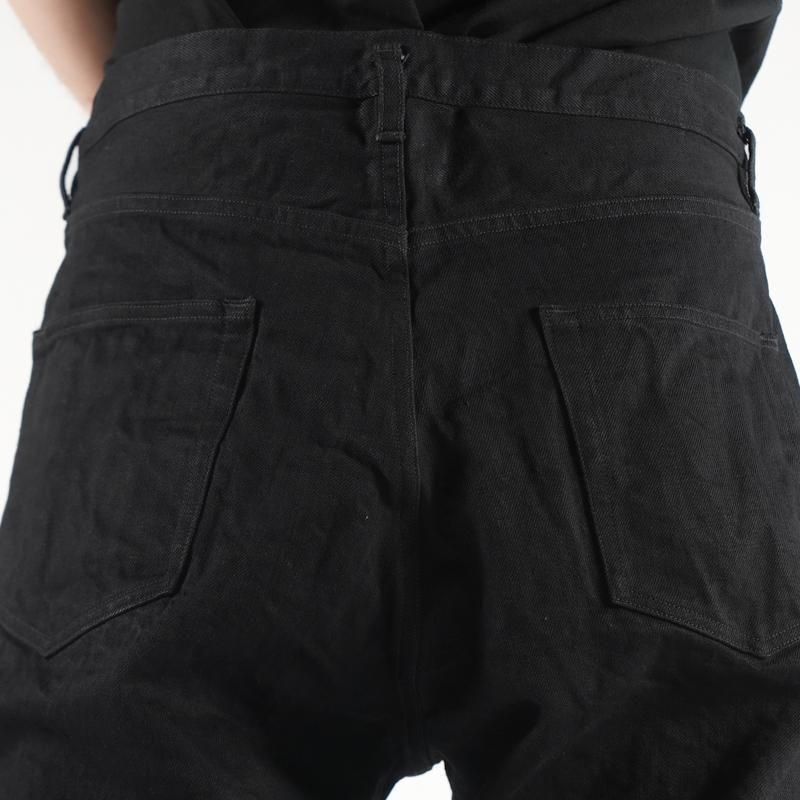13.5ozの中白のブラックデニムで作ったテーパードパンツです。ワンウォッシュ、タンブラー仕上げです。 ステッチカラーを少し赤みのある焦げ茶にして います。 型、サイズ感は以前モールスキン5Pパンツと同様の設定で、太めのテーパードシルエットです。