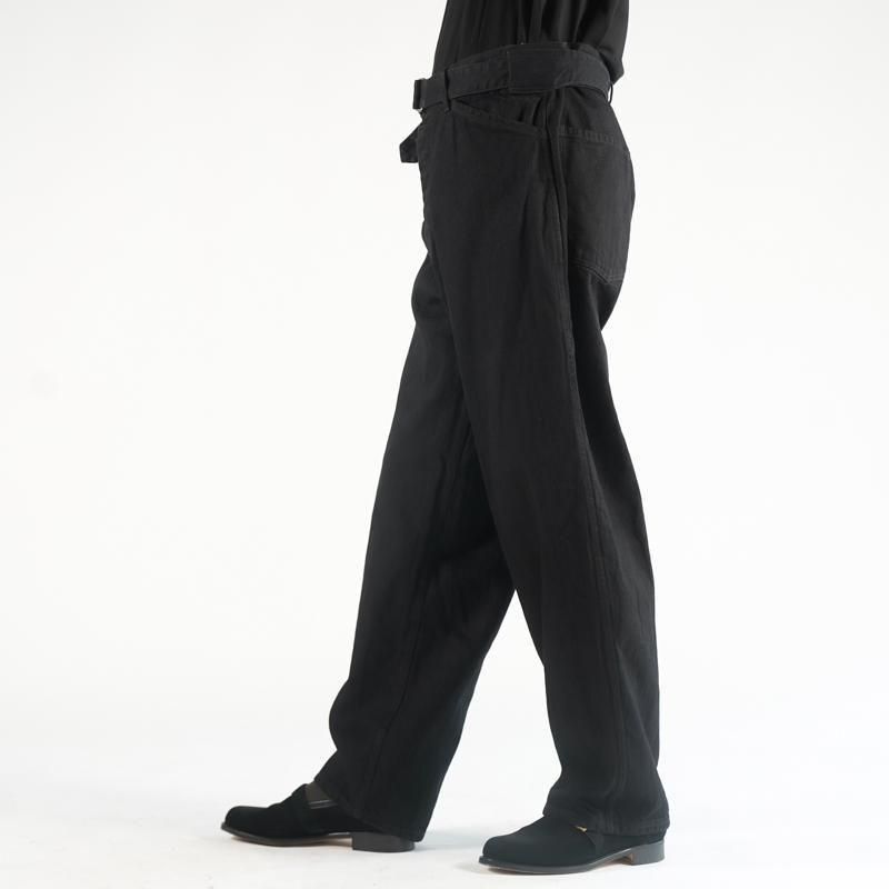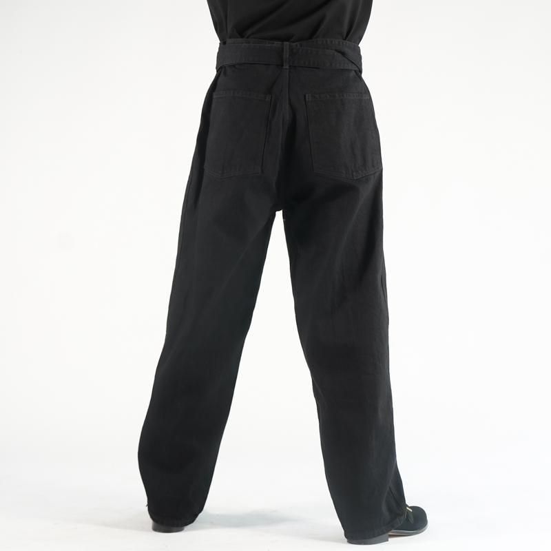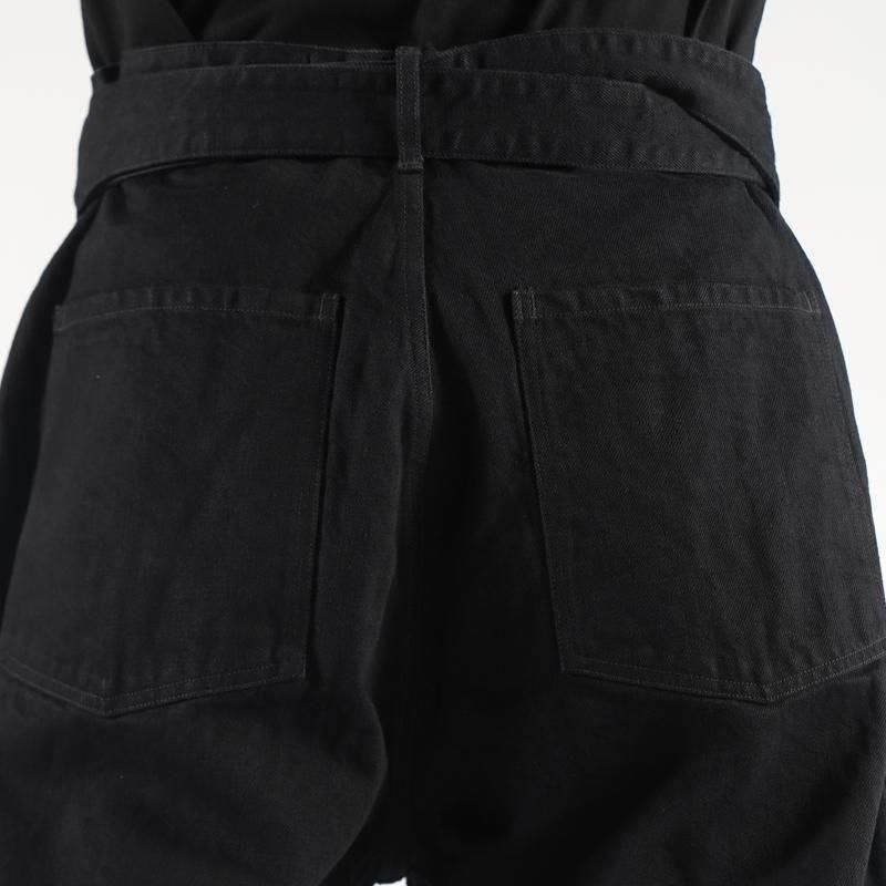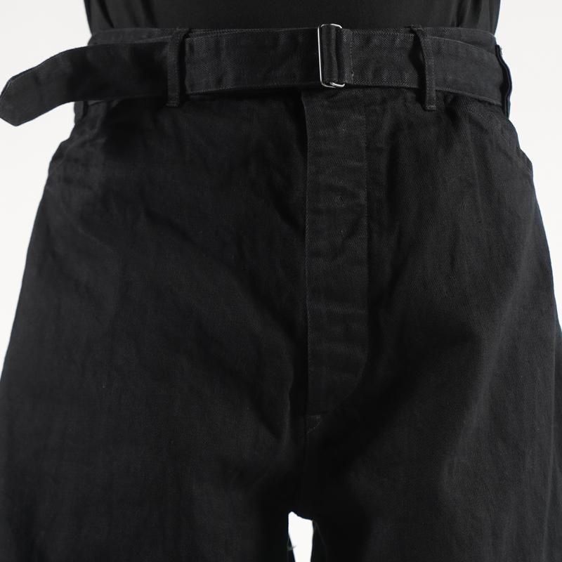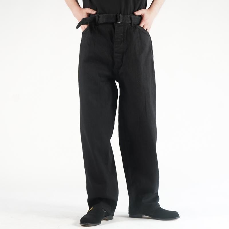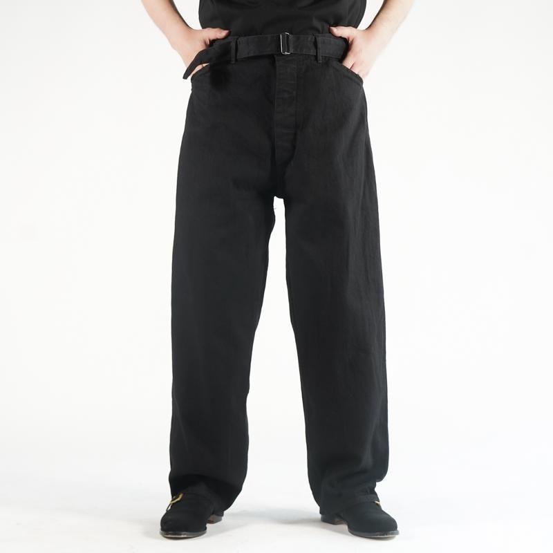 13.5ozの中白のブラックデニムで作ったベルテッドパンツです。ワンウォッシュ、タンブラー仕 上げです。 ステッチカラーを少し赤みのある焦げ茶にして います。
