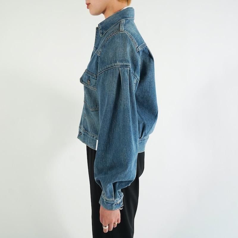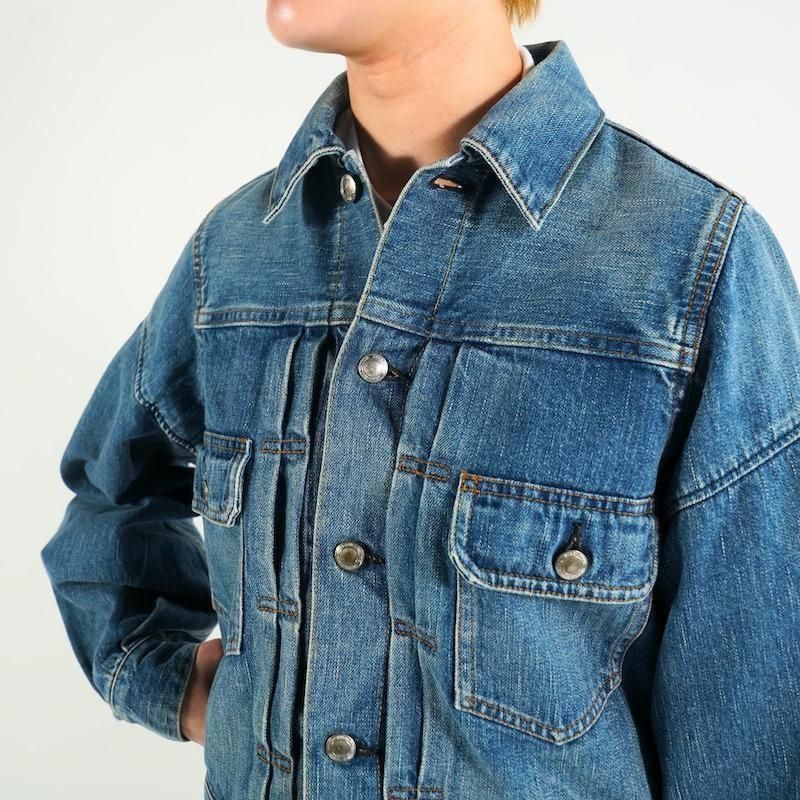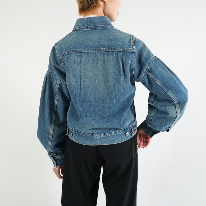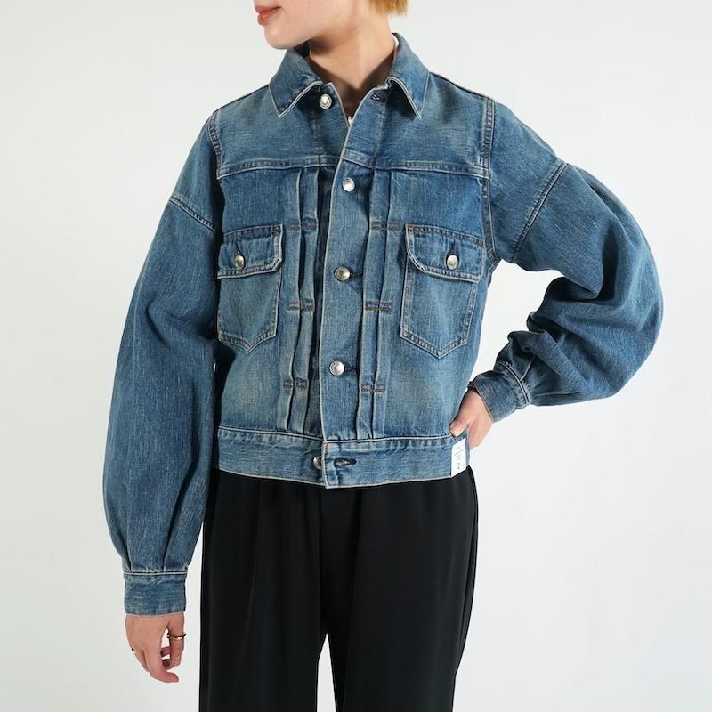 大きなデザインの特徴は袖と後身頃に通常のデニムジャケットよりも大きなタックが入っており立体的な女性らしいフォルムが魅力的な一点です。