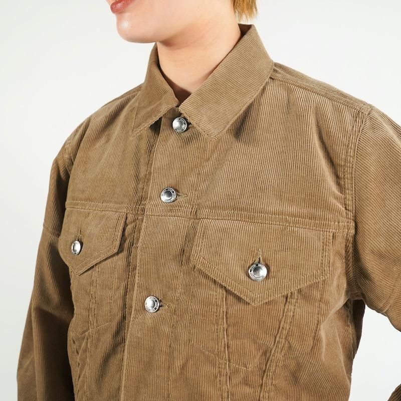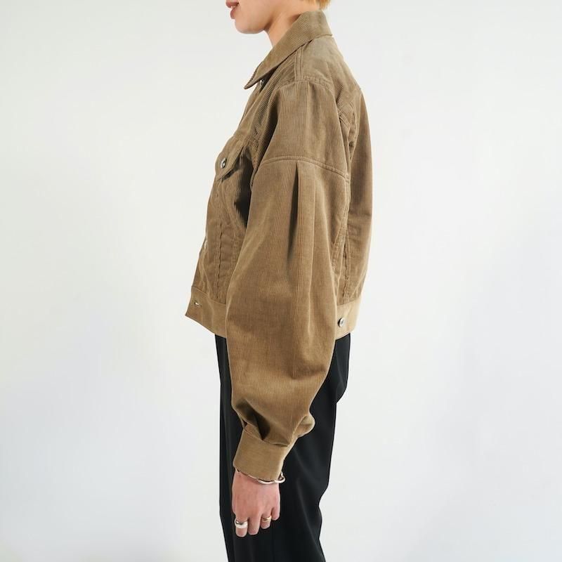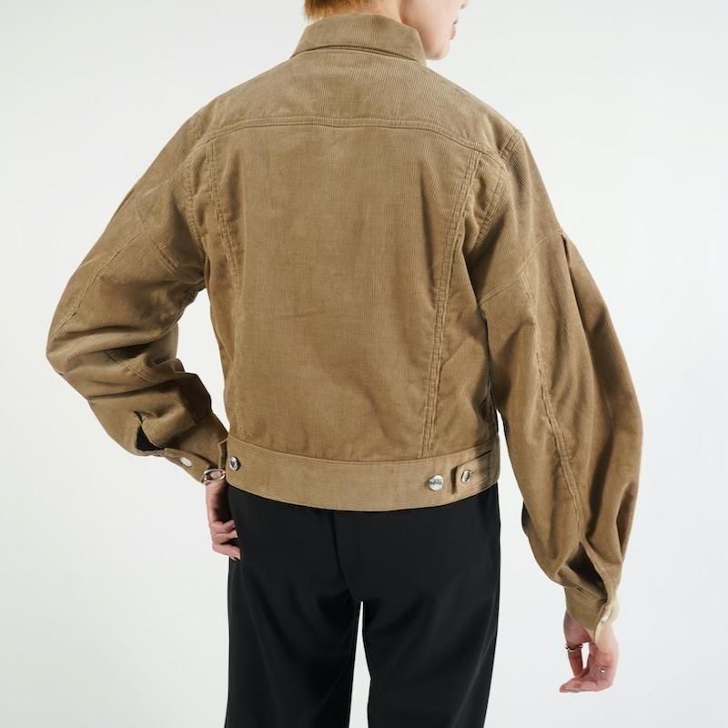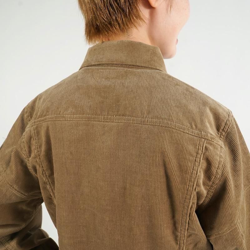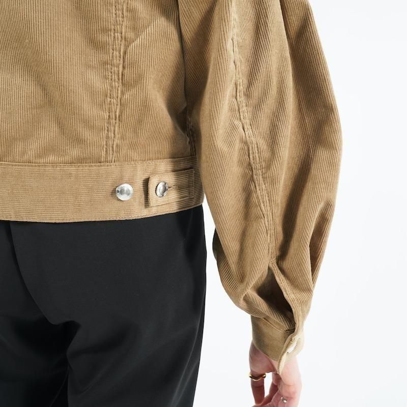 コットン100%の柔らかなコーデュロイ素材を使用した<ハイク>のジャケット。通常よりもパイルの間隔を広く設計し、毛足を短めにカットしているのでユーズドライクな表情に仕上がっています。後ろ身頃にサイドプリーツを入れた、こなれ感あふれるビッグシルエットも特徴。カジュアルなデザインながら、ボリューミーなバルーンスリーブが女性らしさを演出する一着です。