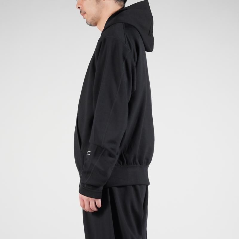 Super 140’s メリノウール軽量裏毛16.5マイクロンの極細な繊維により、肌あたりがよくチクチクしない。メリノウールの繊維は自然の温度調節機能を備えるため、湿気を効果的に吸収し、ドライで快適な着用感が特徴。天然の抗菌性により、汗臭さの原因である菌の繁殖を抑え清潔で快適な状態を保つ。臭いを抑制する高い抗菌・防臭効果効果は、洗濯を繰り返し行っても持続する。