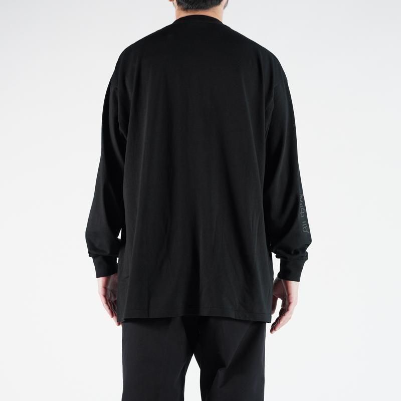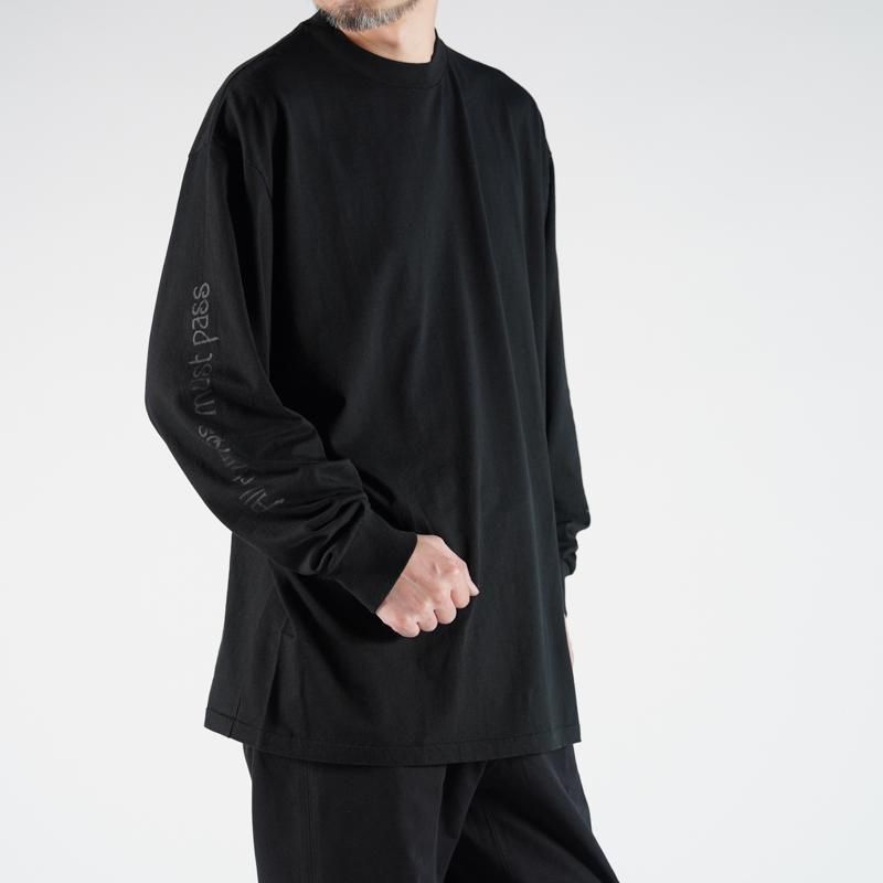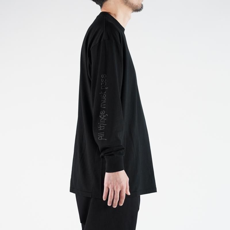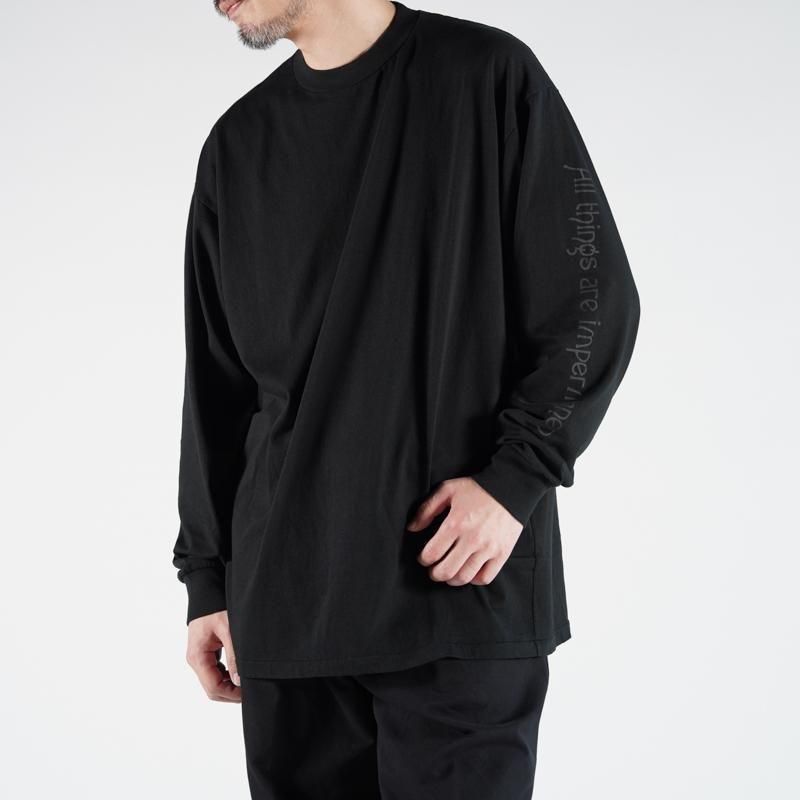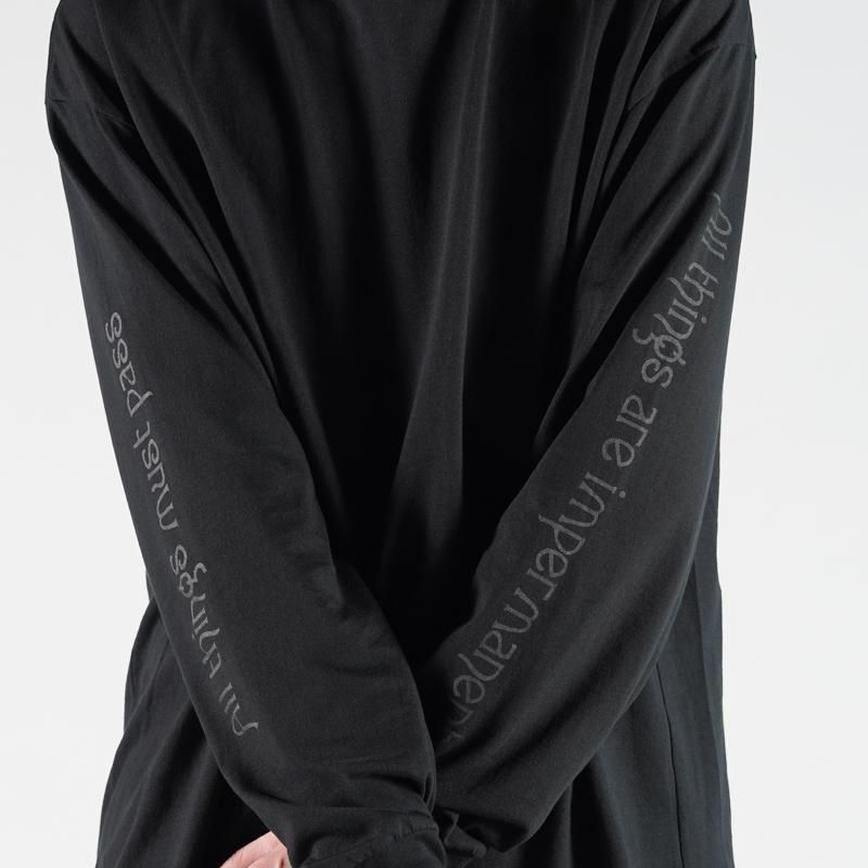 コットン・カシミヤ天竺で作製された秋冬用の長袖Tシャツ。しっとりした柔らかな着心地が特徴で、袖には、「All things are impermanent」「All things must pass」のプリントが入ります。同ブランドの黒のボトムスに、サラッとあわせた感じが、しっくりくる1着です。