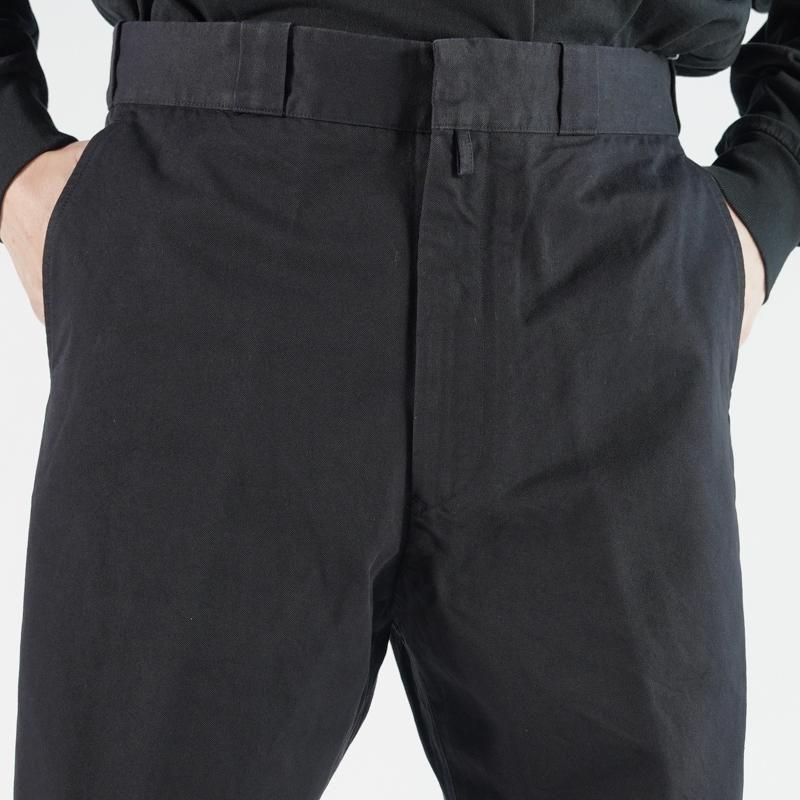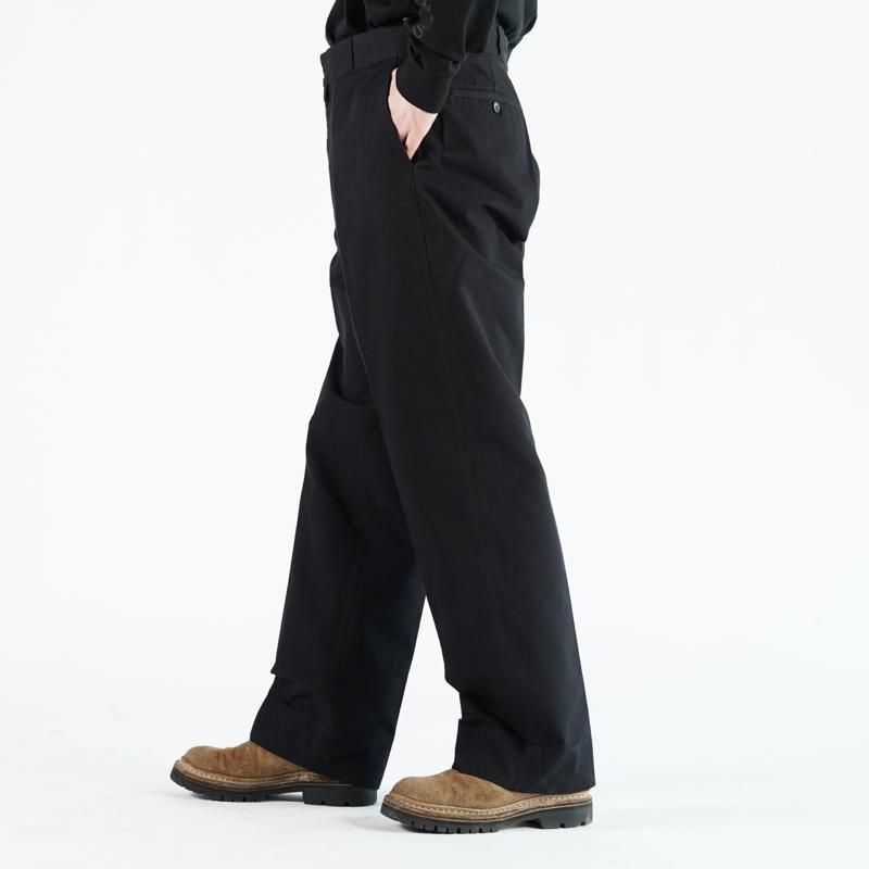 25SSから継続のポストワークツイルパンツ。25SS以前のポストワークツイルよりも少し膨らみのある生地感です。真夏以外に着用できるスタンダードなパンツとして展開。スラックスまでもなく、カジュアル見えもしないため匿名性があり、良い意味で普通のパンツです。何周か回りながら色々な経験をされた方達が、行き着く普通のパンツの一つとして提案。ジャストサイズで着用すると、すっきりとした綺麗なストレートシルエットです。