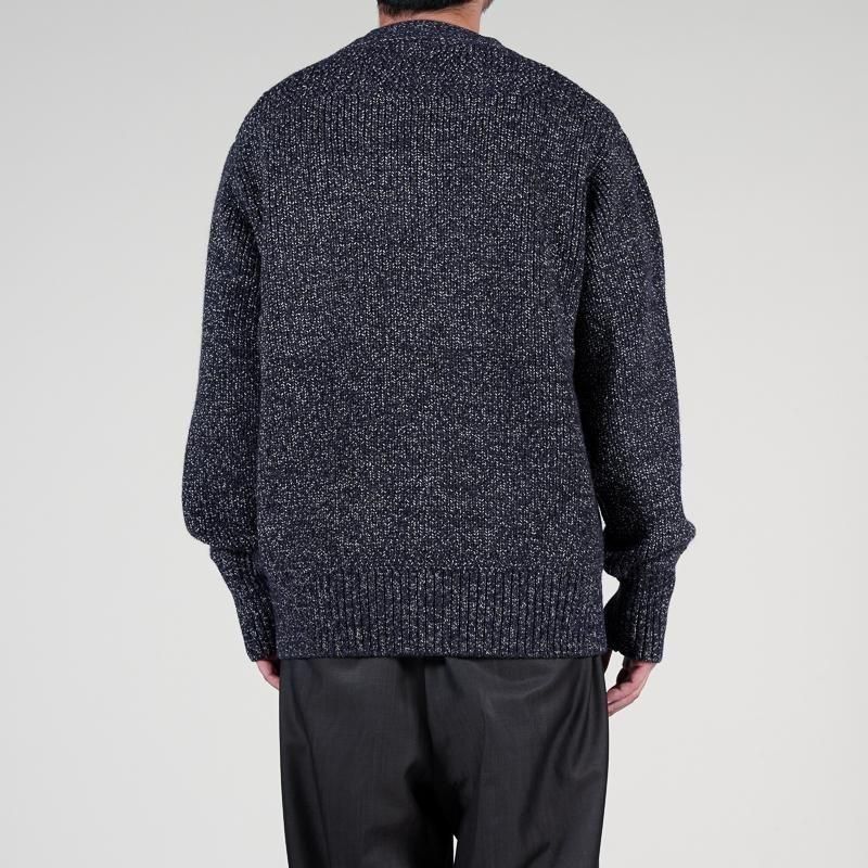 英国羊毛と南米ウールをブレンドした糸で編み立てたシャンブレー調のメカニカルビーチセーター。1930〜1960年代のアメリカのビーチジャケットを参考にした配色となっています。デザインはU.S. ARMY AIR FORCEのA-1セーターなどを参考にしながら、ニットならではの柔らかさと伸縮性を活かして着心地よく仕立てています。