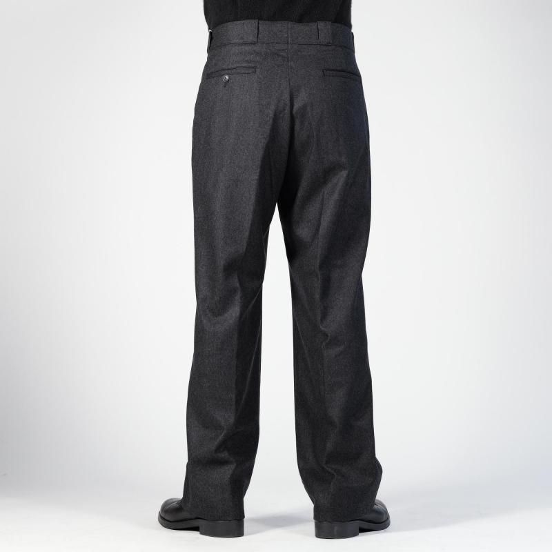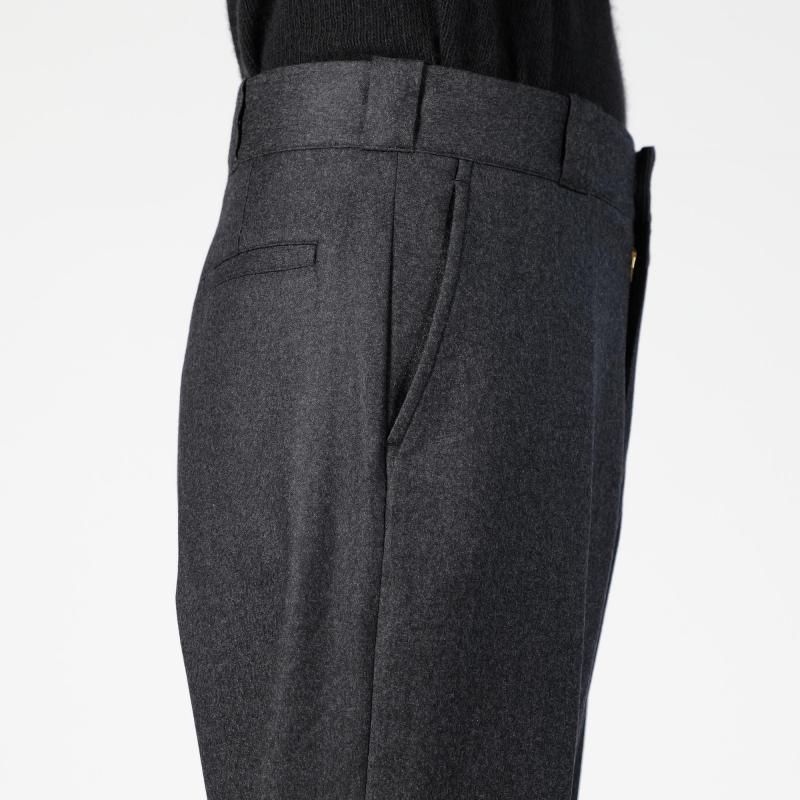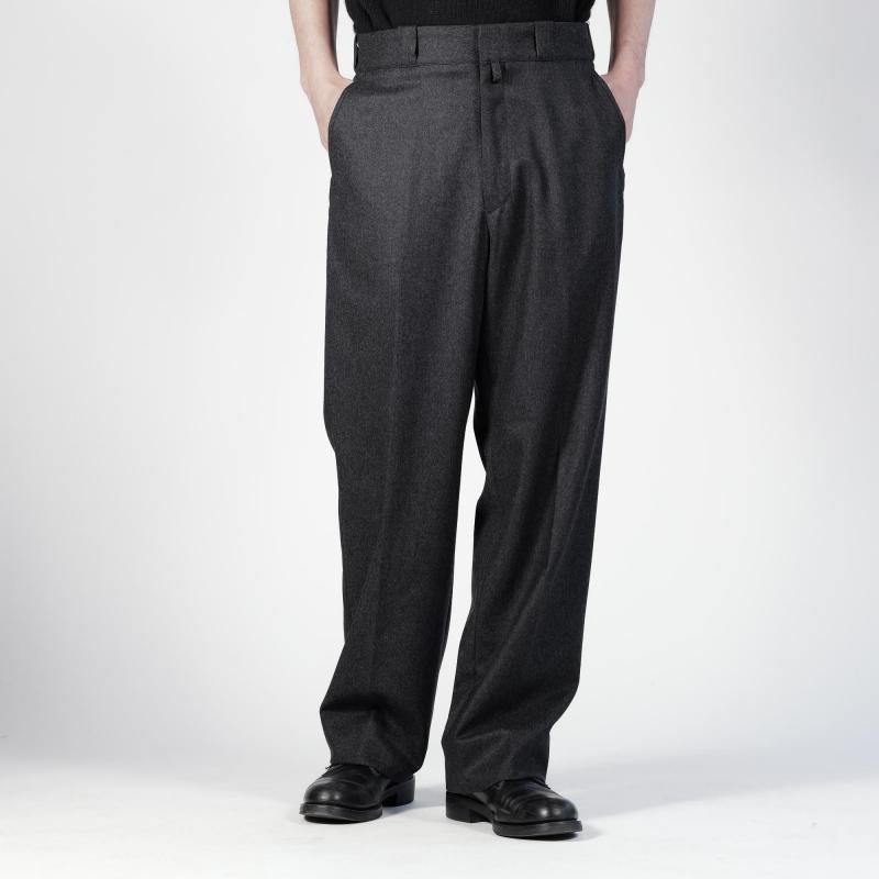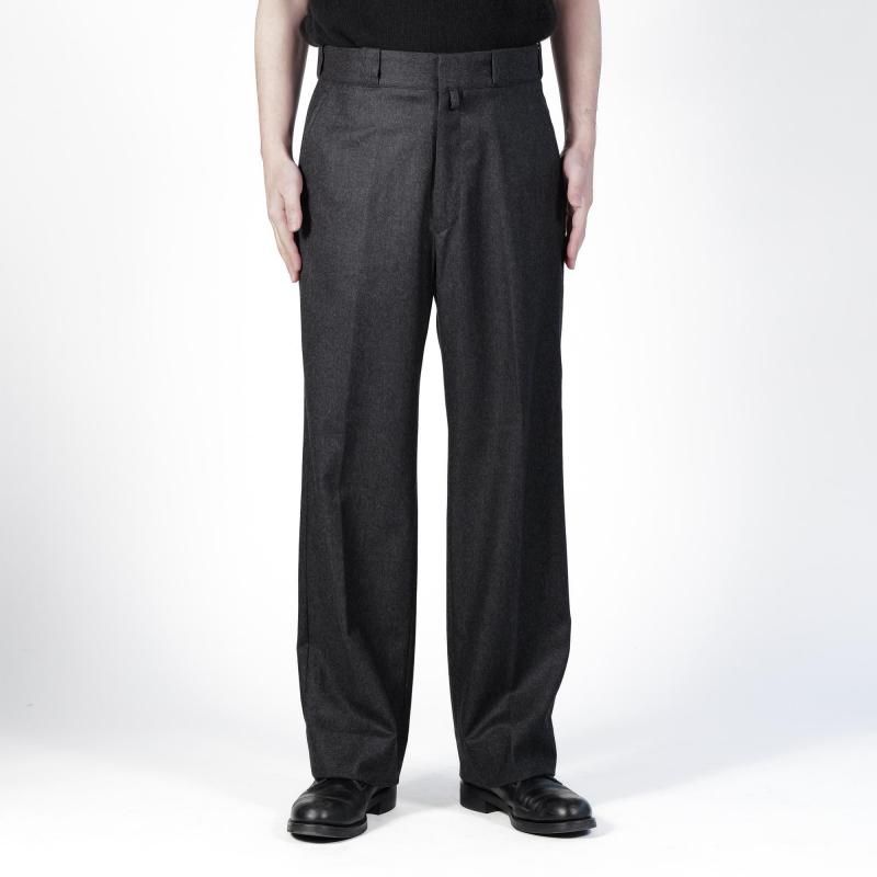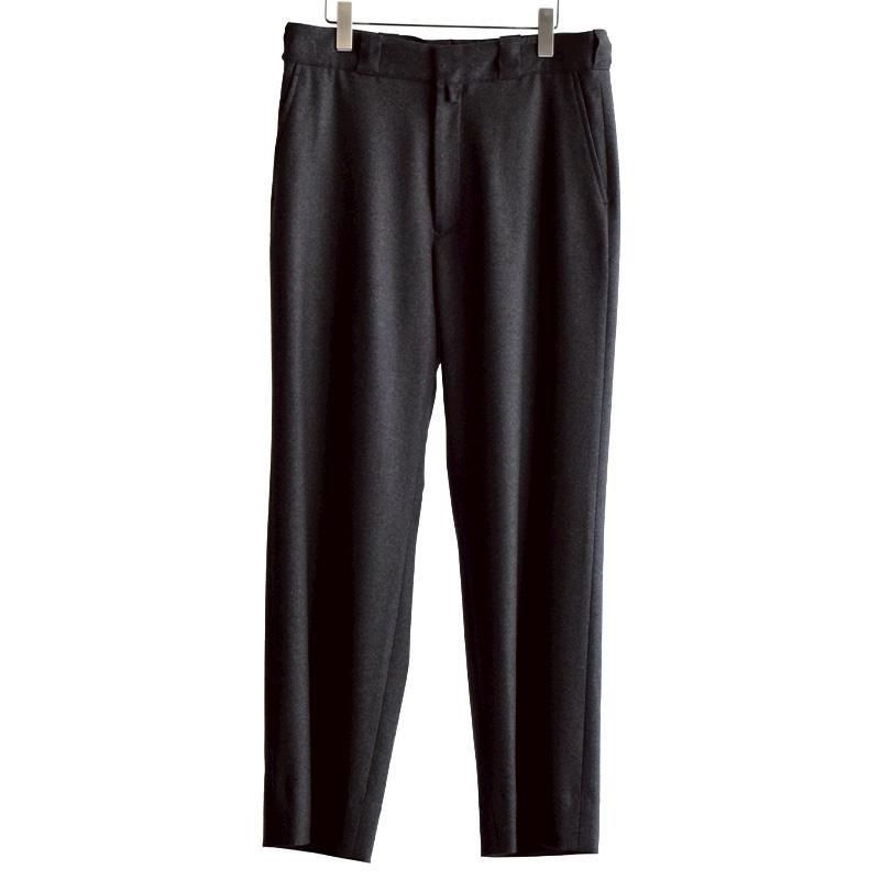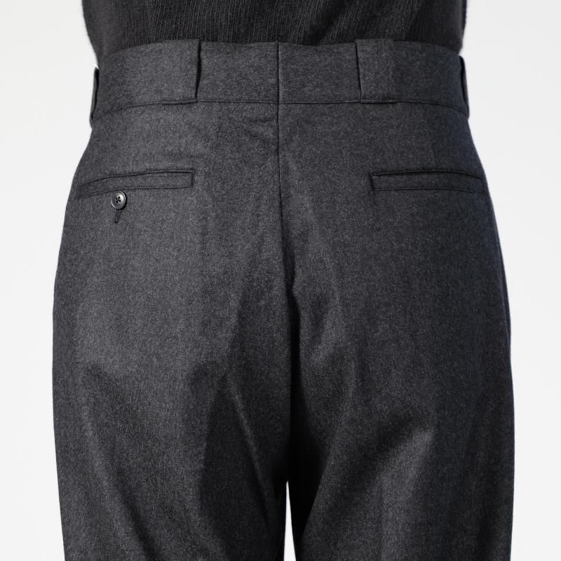 薄手で柔らかく滑らかな手触りのウールフラノ生地を使用した秋冬シーズンのスタンダードなパンツとして展開。スラックスまでもなく、カジュアル見えもしないため匿名性があり、良い意味で普通のパンツです。何周か回りながら色々な経験をされた方達が、行き着く普通のパンツの一つとして提案。ジャストサイズで着用すると、すっきりとした綺麗なストレートシルエットです。型は25SSのポストワークツイルパンツと同型にして、24AWよりもワンサイズシルエットを大きくしています。