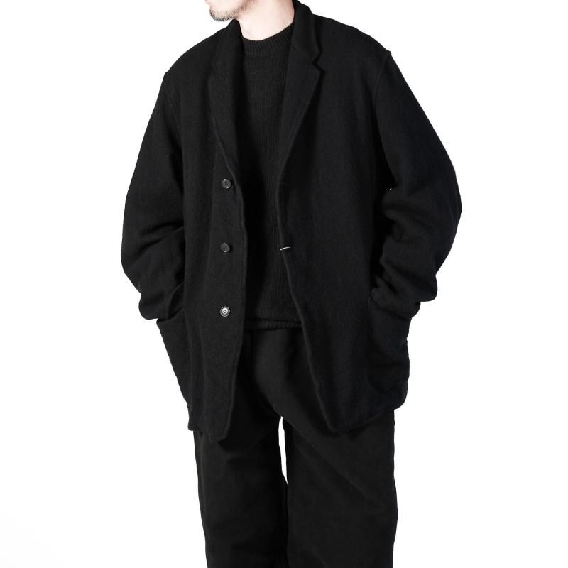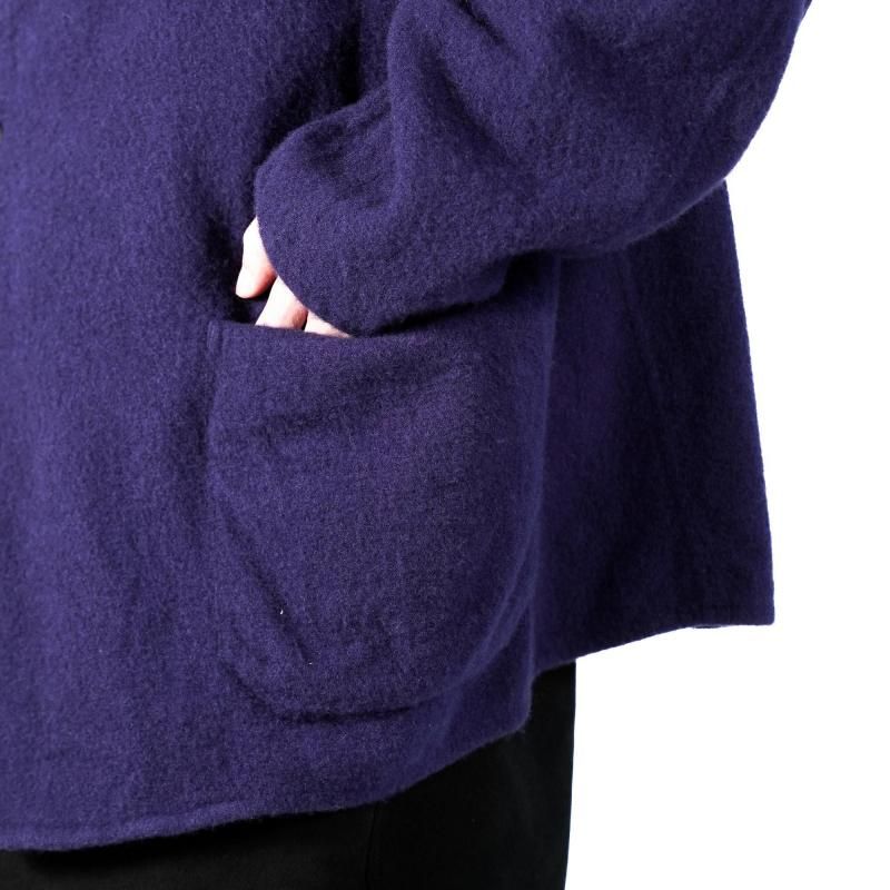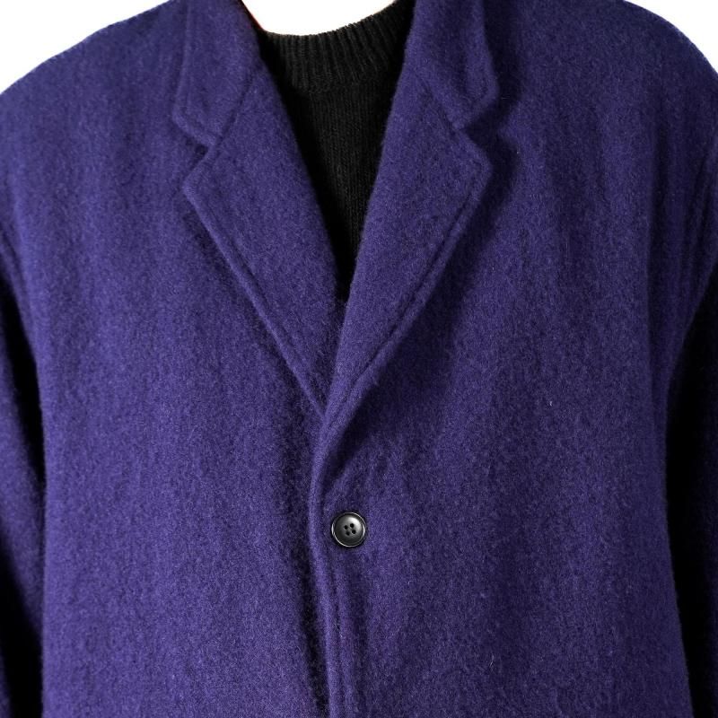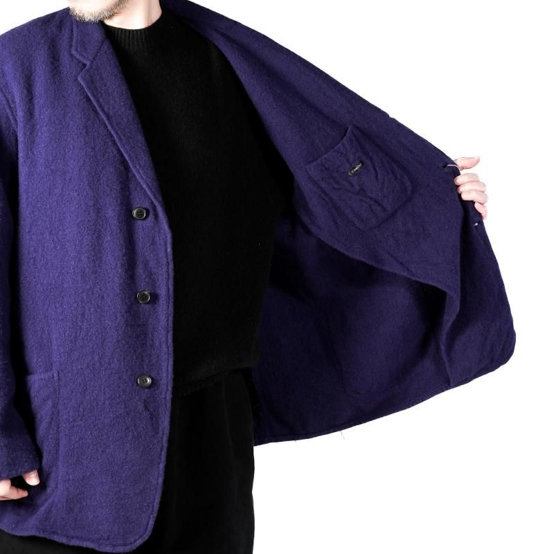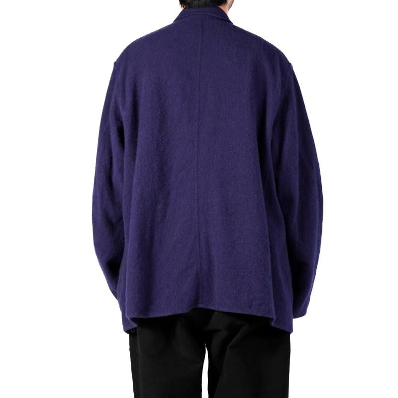 柔らかく軽い着心地と風合いのある素材感が特徴の1着。ラペルの返りも曖昧な仕様で適当な感じでゆったりと羽織るのがお勧めです。今シーズンの新色としてPURPLE BLUEを展開。ほんの赤みのあるブルーは、黒いスタイルに羽織うイメージで提案するカラーです。